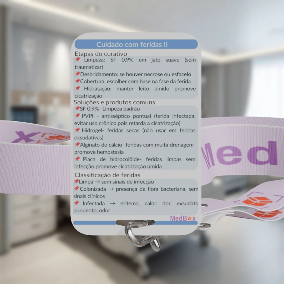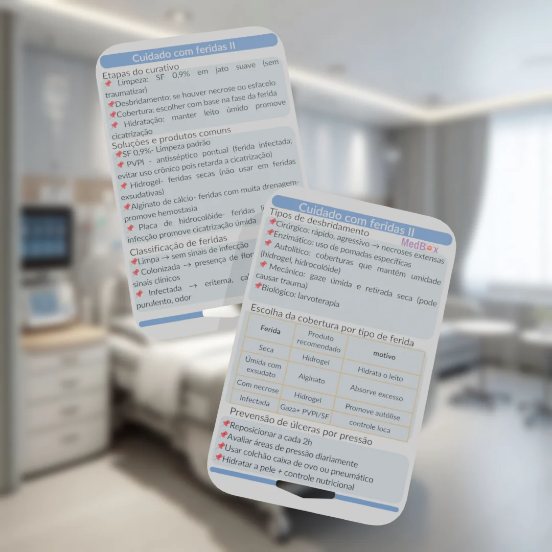 • O Card de Cuidados com Feridas 2 organiza de forma prática todas as etapas do cuidado com feridas e curativos, garantindo segurança e eficiência nas condutas. Contém: