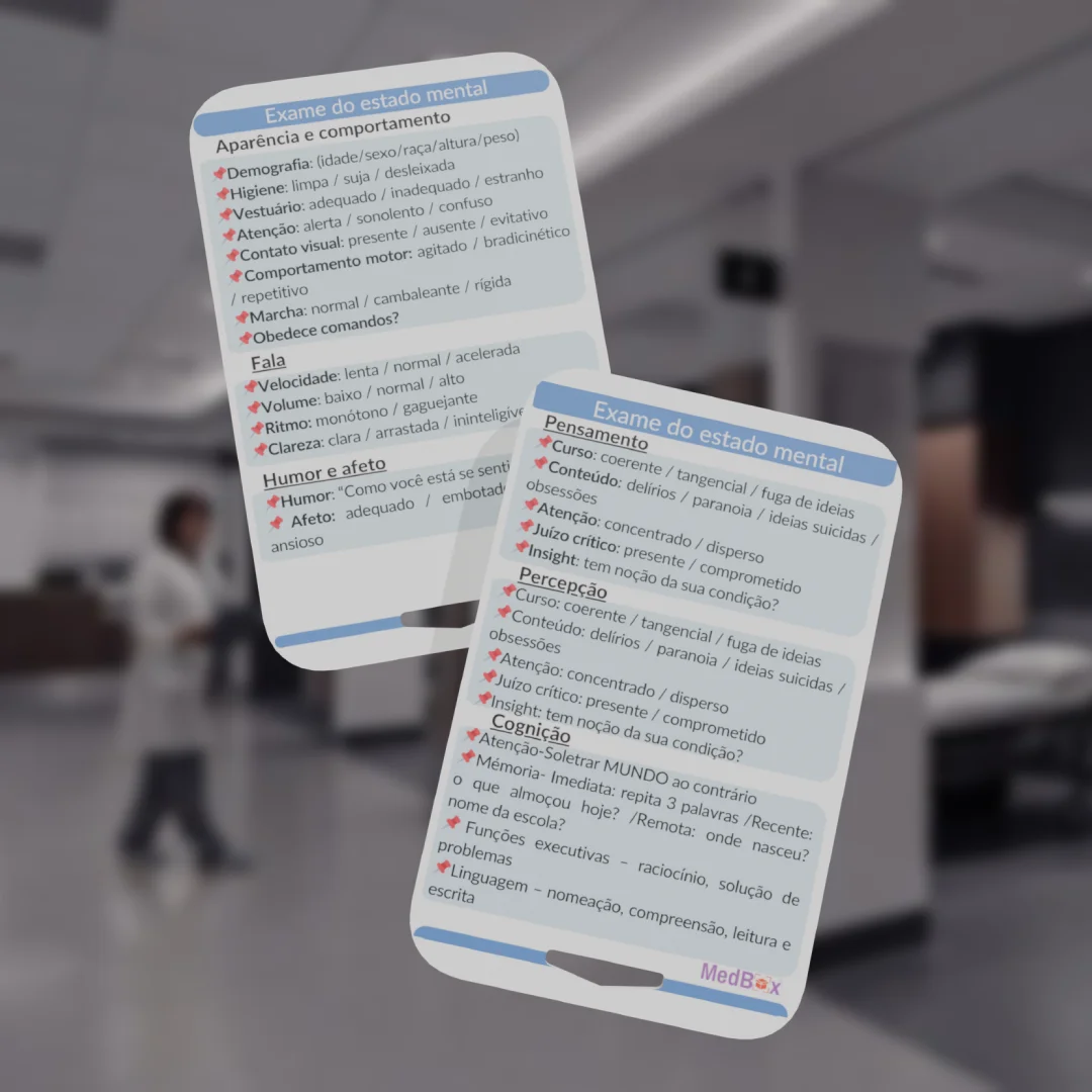 • O Card de Exame do Estado Mental organiza os principais domínios da avaliação psiquiátrica e neurológica, auxiliando na condução estruturada e segura da anamnese. Contém: