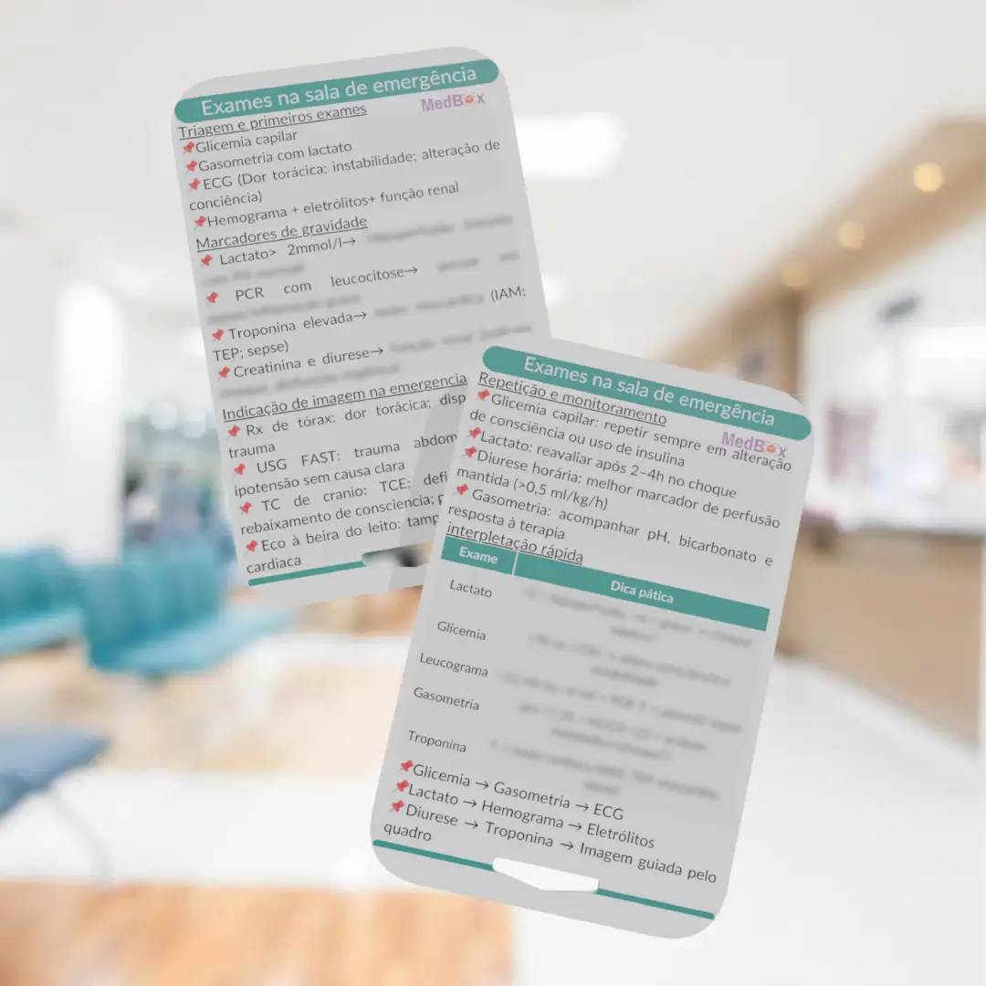 • O Card de Exames na Sala de Emergência organiza de forma prática os principais passos para avaliação e monitorização de pacientes críticos. Contém: