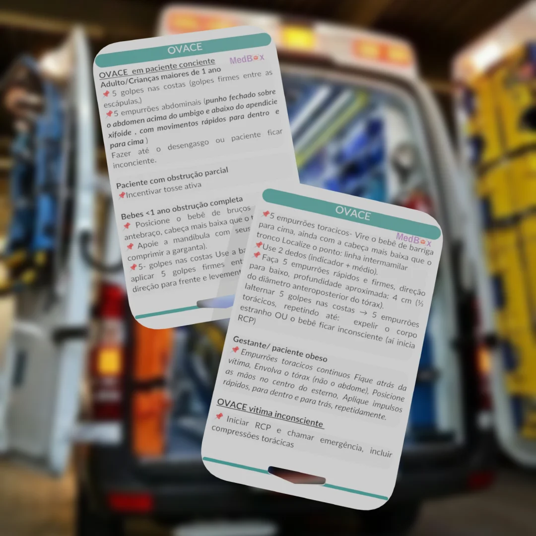 • O Card de OVACE (Obstrução de Via Aérea por Corpo Estranho) reúne todas as condutas práticas e atualizadas para o manejo da obstrução em diferentes perfis de pacientes, garantindo agilidade e segurança no atendimento a Adulto consciente, Gestantes, Lactentes (<1 ano) e Paciente inconsciente: